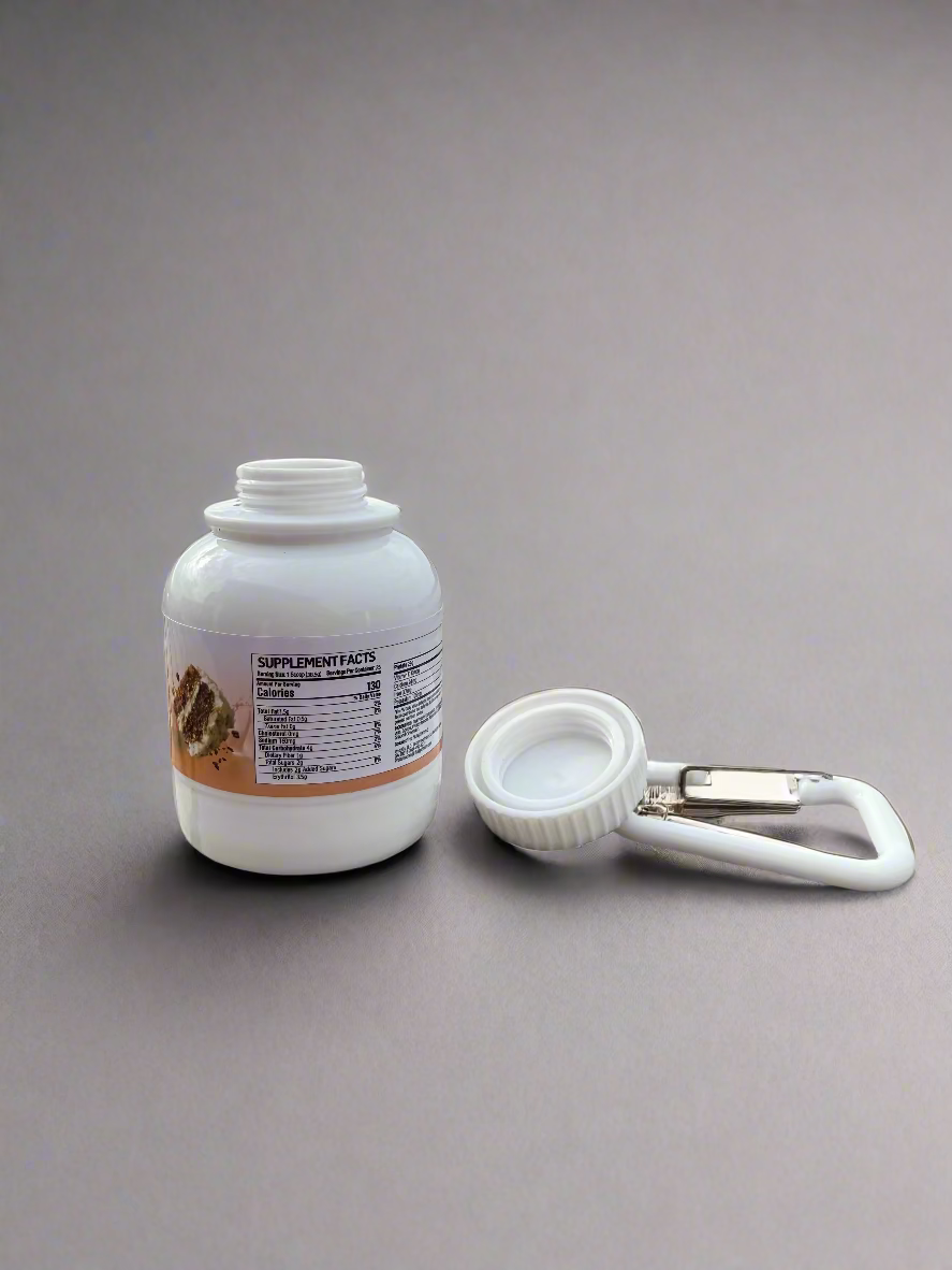 Take your protein to go! Load your keychain at the bottom and funnel from the top right into your shaker! Getting those gains just got easier!